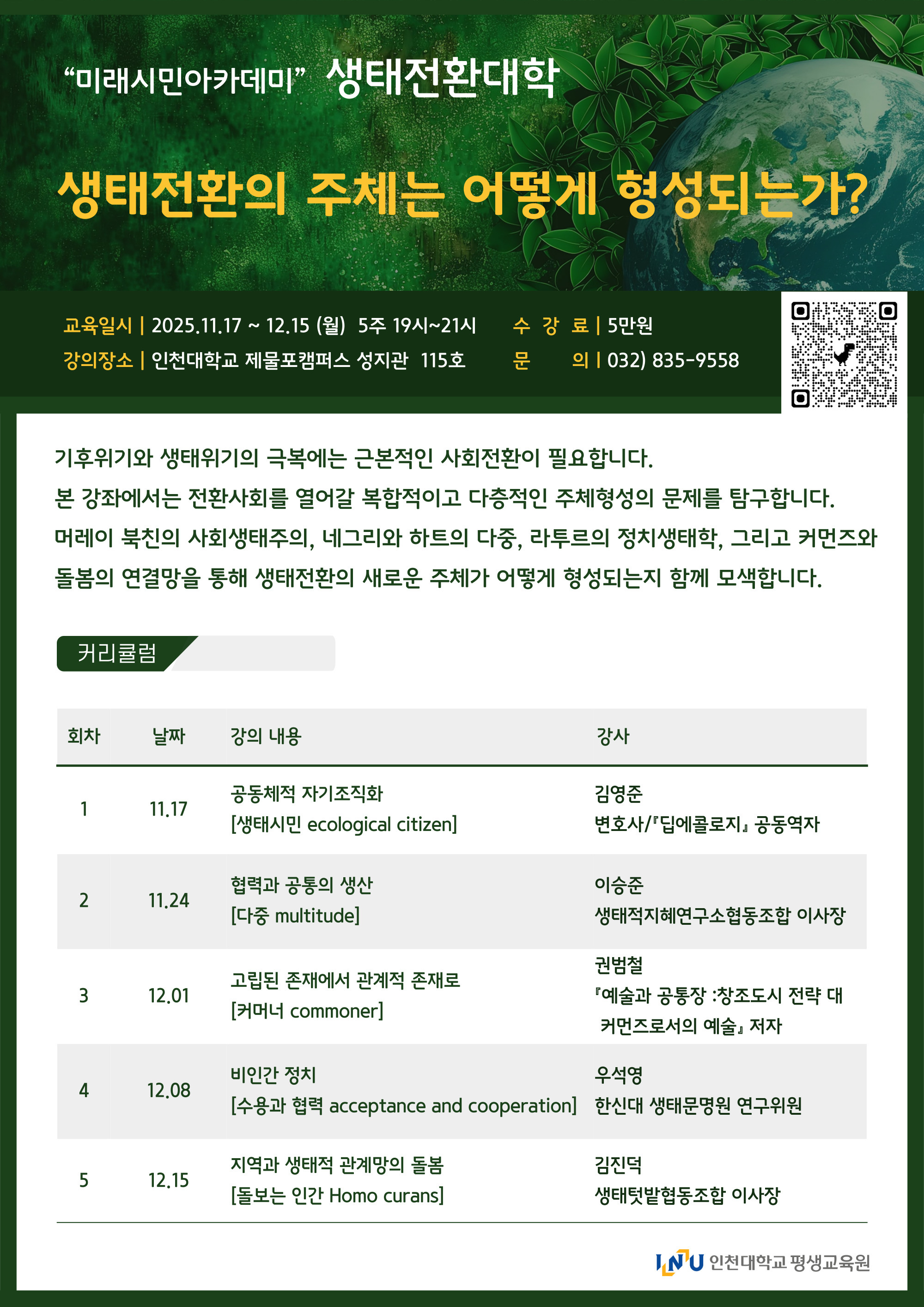 [인천대학교 평생교육원] 2025년 생태전환대학과정 수강생 모집