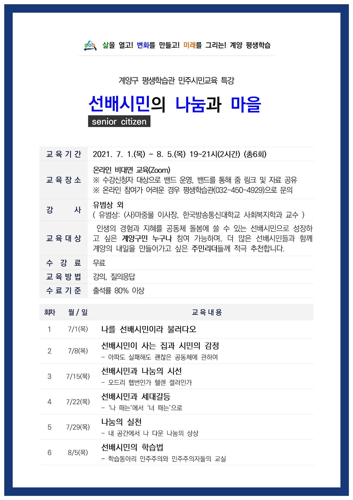 - 교육기간 : 2021. 7. 1.(목) ~ 8. 5.(목) 19~21시(2시간) (총6회)