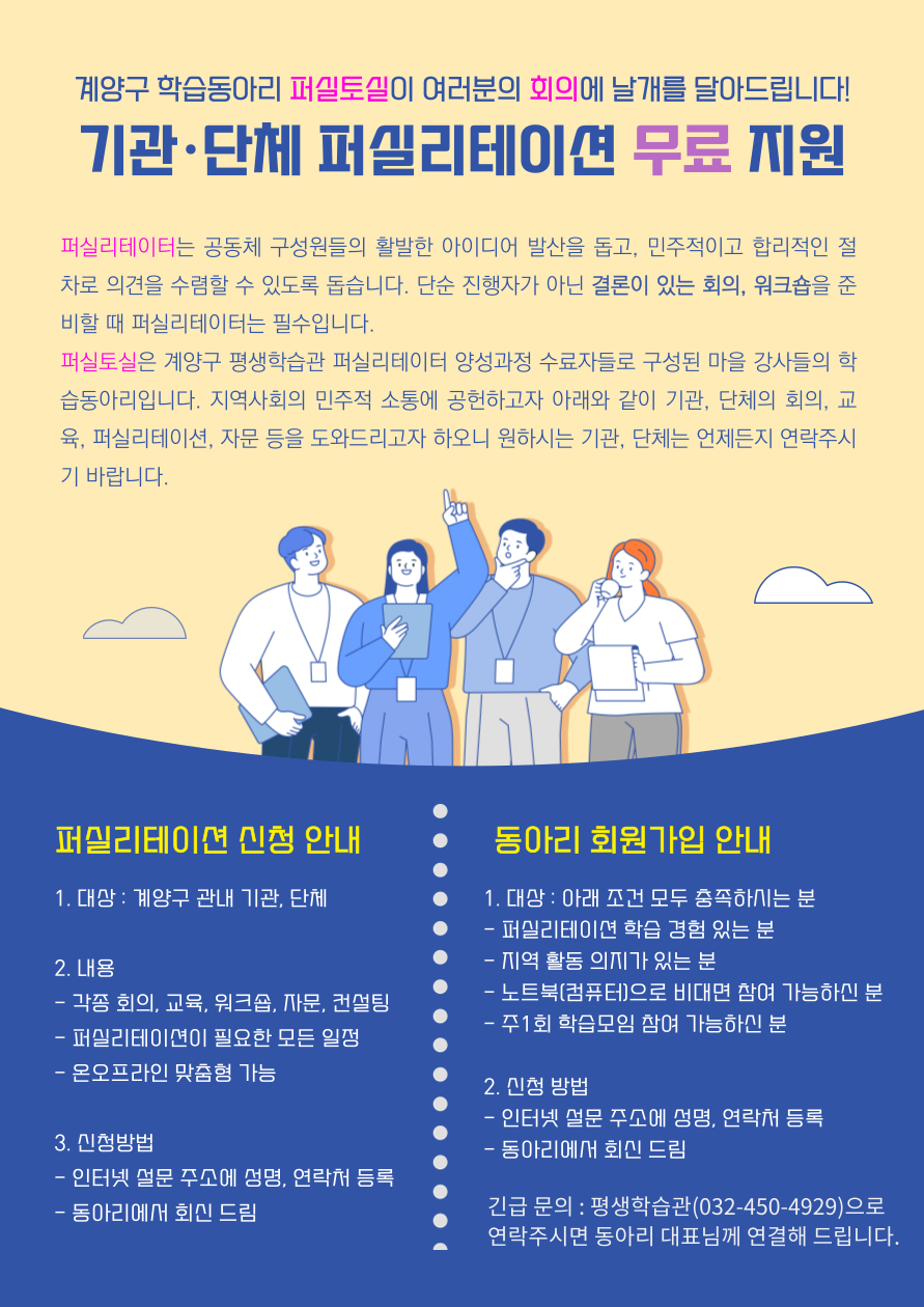 그리고 퍼실토실에서 계양구 관내 기관 및 단체의 회의, 워크숍 등을 무료로 지원해드린다고 하오니 안내문을 잘 참고해주세요!