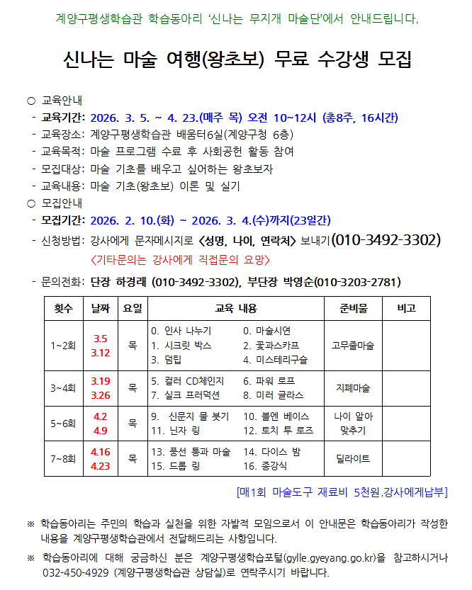 - 모집대상: 마술 기초를 배우고 싶어하는 왕초보자