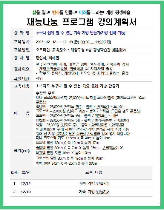 [12월 재능나눔] 누구나 쉽게 할 수 있는 가죽 가방 만들기(가방 선택 가능)
